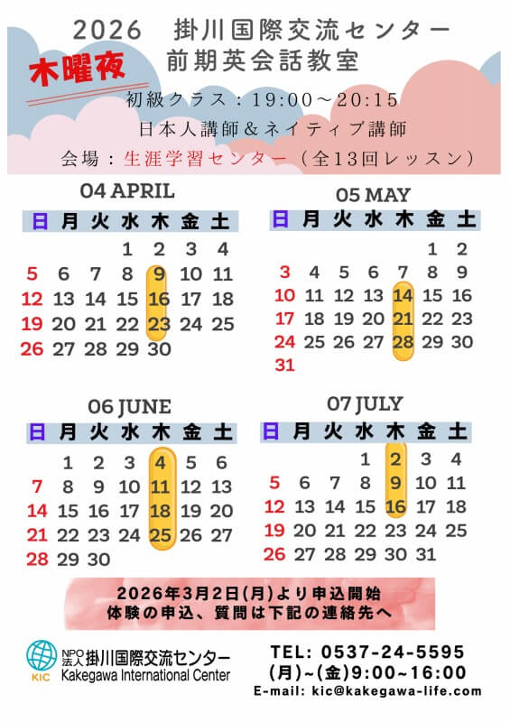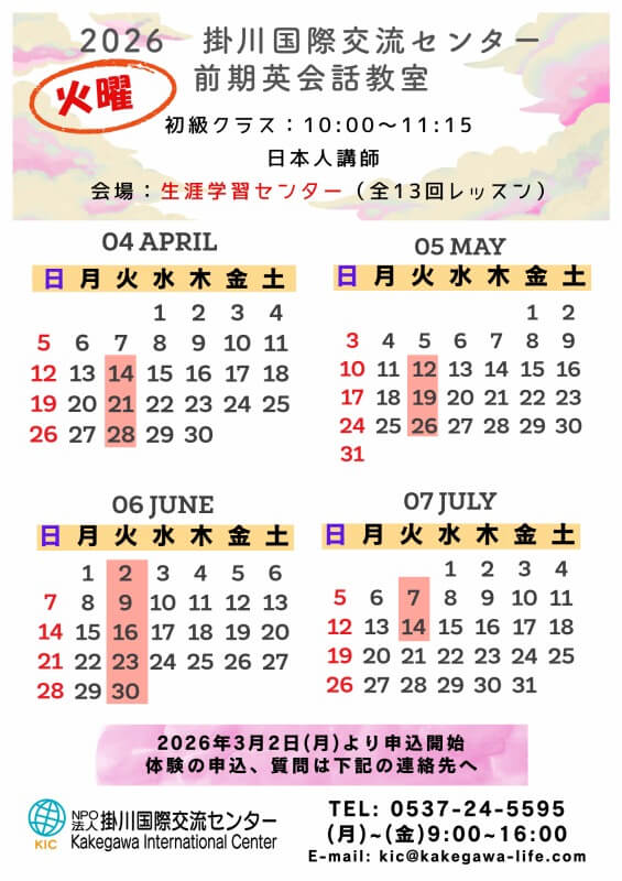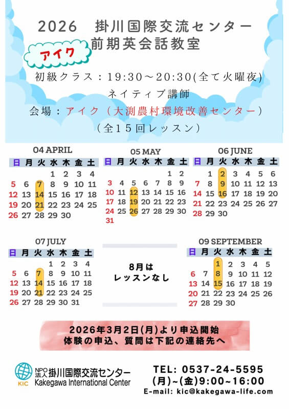 2026年4月から掛川市生涯学習センターとアイクにてKIC英会話教室が開催されます。